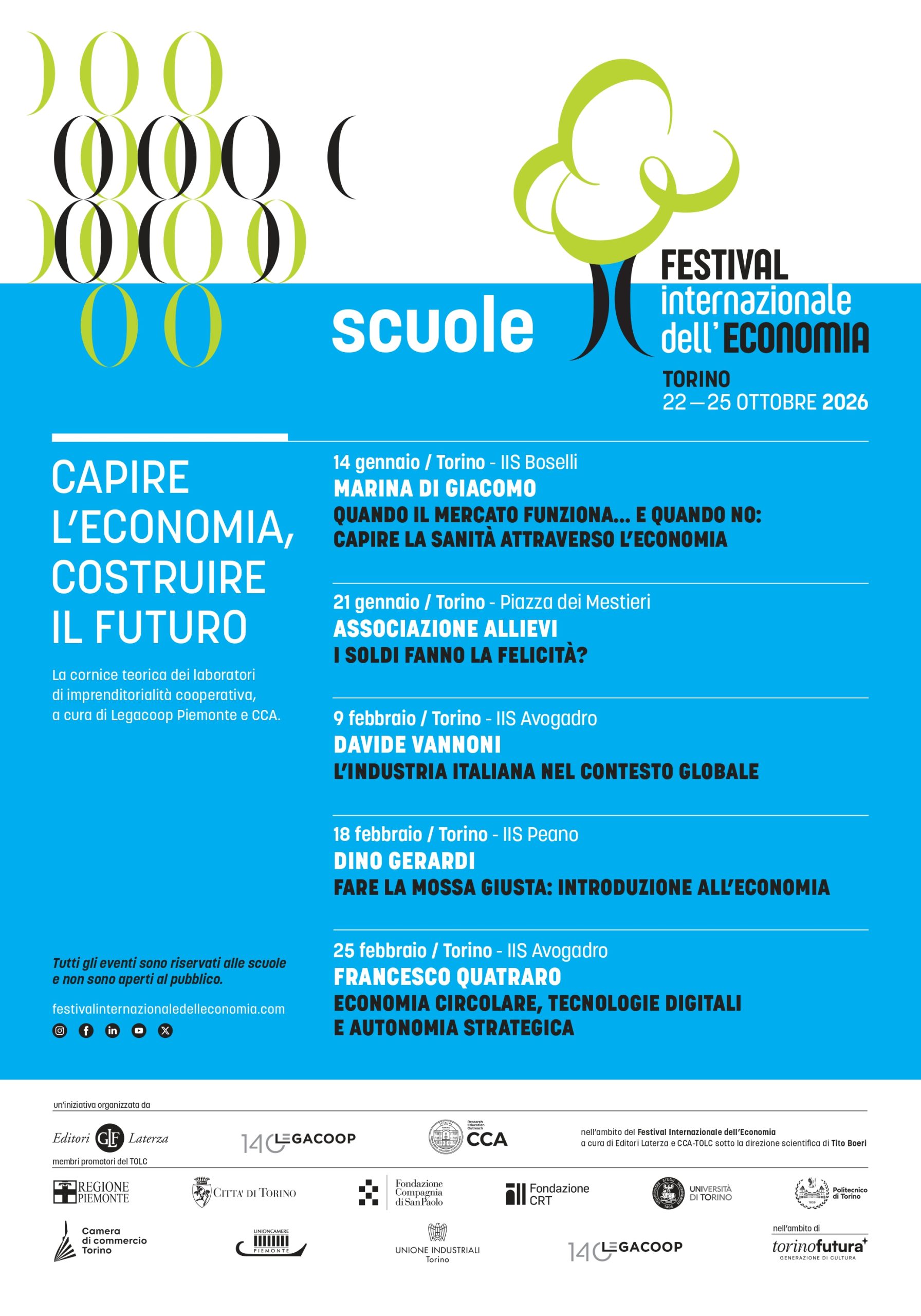 2) Il programma “Capire l’economia, costruire il futuro”, realizzato in collaborazione con Legacoop Piemonte, si inserisce nella cornice dei laboratori di imprenditorialità cooperativa curati da Legacoop Piemonte e dal Collegio Carlo Alberto e accompagna gli studenti nella comprensione delle principali dinamiche economiche che interessano tanto il mondo universitario quanto quello del lavoro. Il percorso affronta temi quali il funzionamento dei mercati e i loro limiti, il rapporto tra economia e benessere, il ruolo dell’industria italiana nel contesto globale, le scelte economiche individuali e collettive e le prospettive offerte dall’economia circolare e dall’innovazione.
