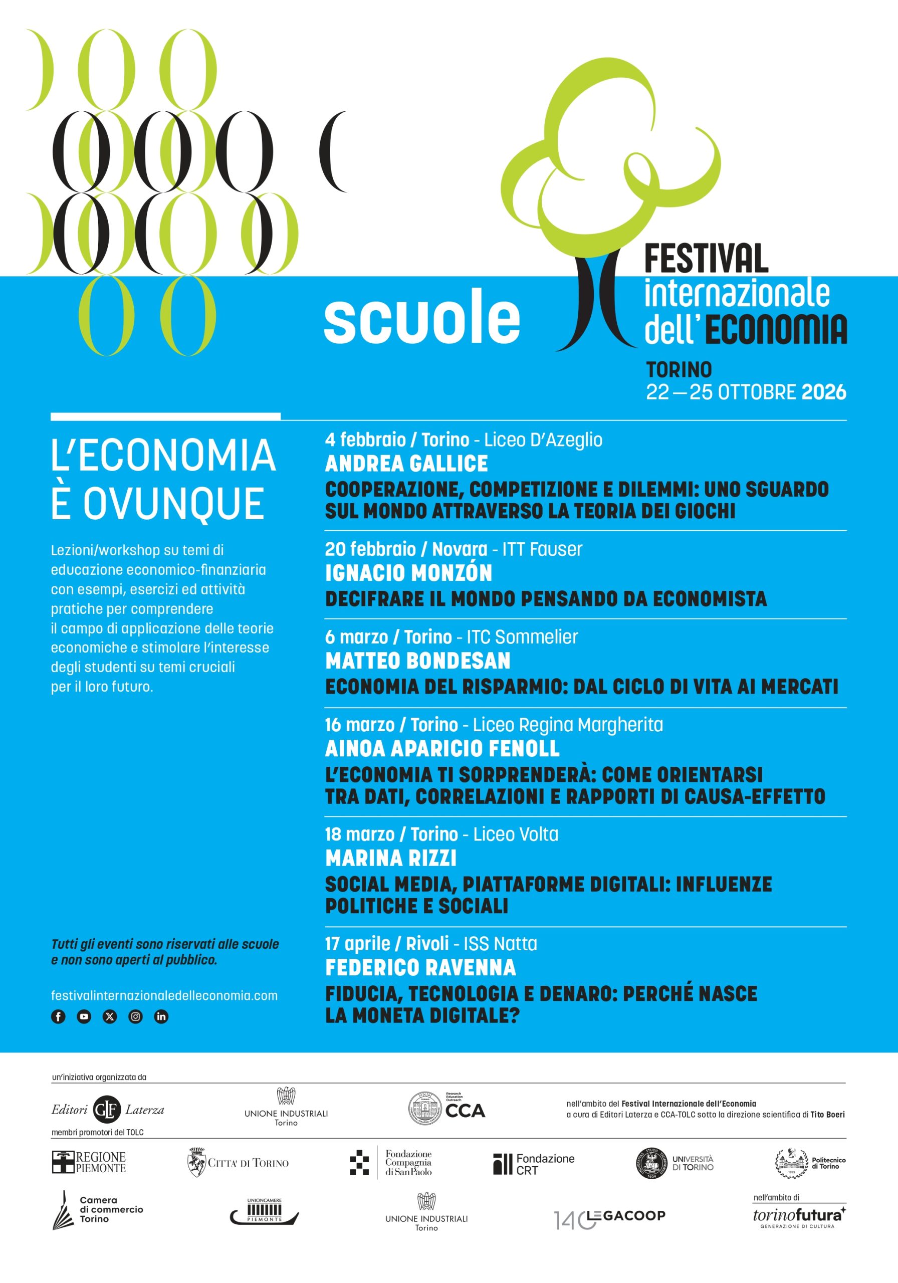 1) Il programma “L’economia è ovunque”, ideato insieme all’area Education di Unione Industriali Torino, propone un ciclo di lezioni e workshop di educazione economico-finanziaria pensati per mostrare come l’economia sia presente nella vita quotidiana. Attraverso esempi concreti, esercizi e attività pratiche, gli studenti sono stimolati a interpretare la realtà con gli strumenti dell’economia e a riflettere su temi cruciali quali il risparmio, l’uso dei dati, il funzionamento dei mercati digitali, le dinamiche dei social media, il ruolo della fiducia e le trasformazioni legate alla moneta e alle nuove tecnologie.
